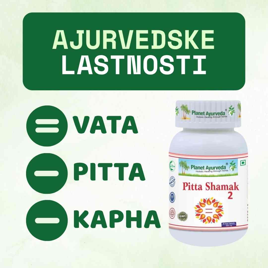 Ajurvedski pogled – Uravnoteženje doše pitta V ajurvedi doša pitta, sestavljena iz elementov ognja in vode, uravnava presnovo, prebavo in transformacijo v telesu. Dejavniki, kot so stres, vroče vreme ali pekoča hrana, lahko vodijo do njenega presežka. Formula Pitta Shamak uporablja tradicionalna zelišča s »hladilnimi« (Sheetal) lastnostmi za podporo ohranjanju naravnega ravnovesja pitte.